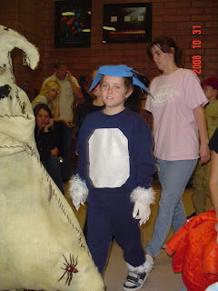 Here is Toph. He decided to be Megaman again this year which was nice because I didn't have to make another costume! I was a dead crossing guard. I put a tire mark over me and painted my face like a skeleton with some blood coming out. Trust me, some days it isn't a far stretch. I forgot to take a picture of myself though, so you'll have to use your imagination. We had fun!